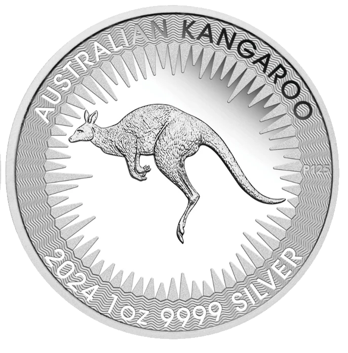Das Motiv ist das Känguru im Strahlenkranz-Design, dazu Umschrift „Australian Kangaroo“, Gewicht „1 oz 9999 Silver“ und Prägejahr.